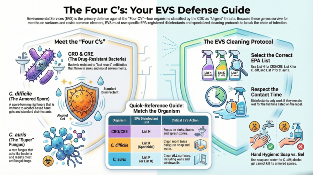 The first two C’s are CRO and CRE, which stand for Carbapenem-Resistant Organisms and Carbapenem-Resistant Enterobacterales. Carbapenems were once considered the last resort of antibiotics, the big guns. These organisms developed an enzyme that literally chews them up and makes them useless. CRE alone was responsible for an estimated 1,100 deaths in the United States in 2017, and a 2015 outbreak linked to an improperly disinfected scope at UCLA put the danger of small hygiene lapses on national display. The right disinfectant for these organisms comes from EPA List H, and wet contact time is not optional.